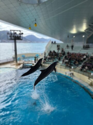 イルカショーを見てイルカの鳴き声やジャンプにびっくりしたり、
